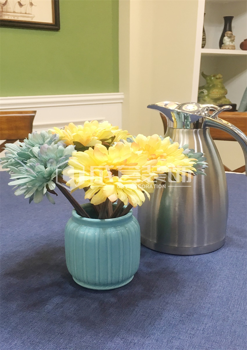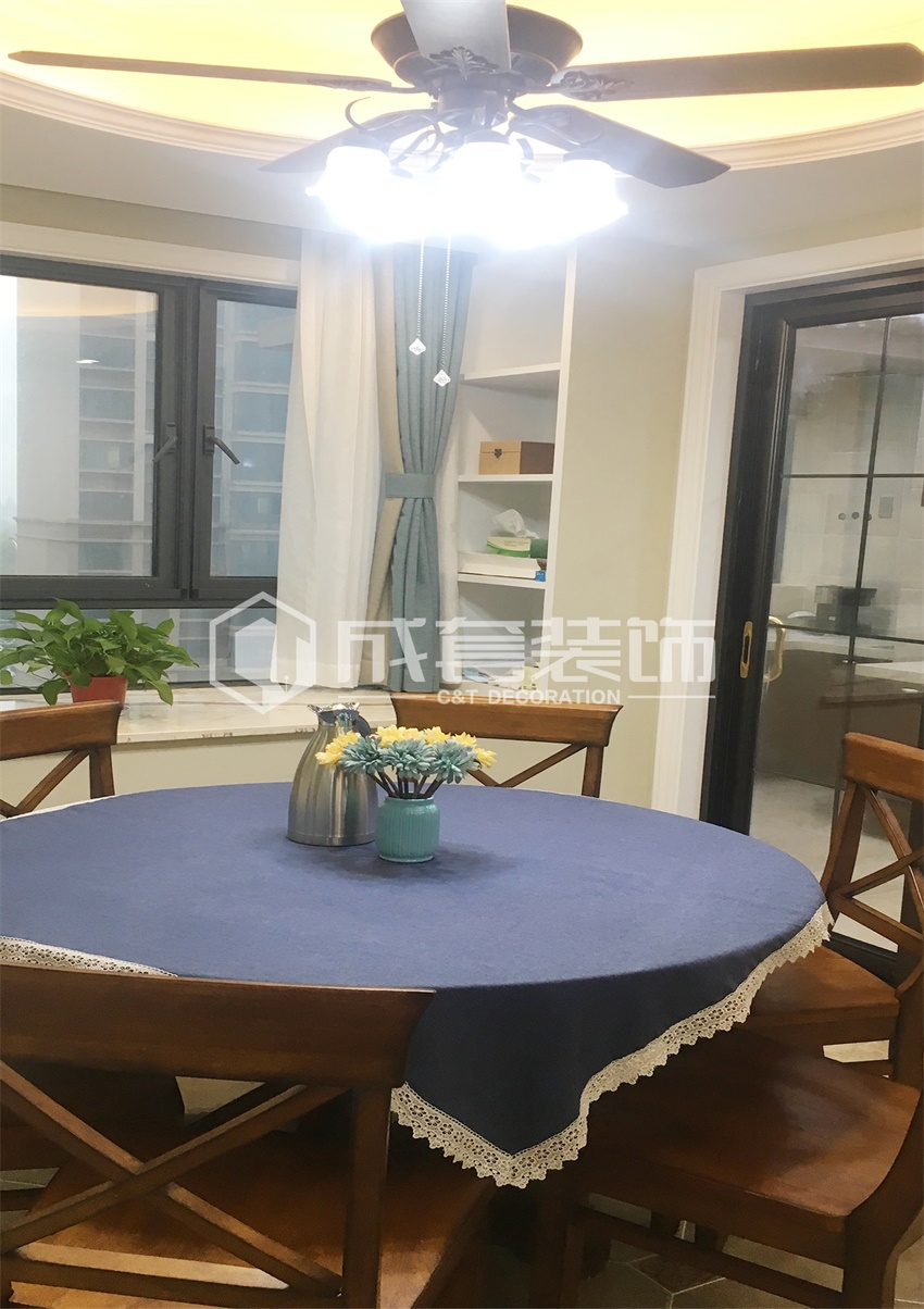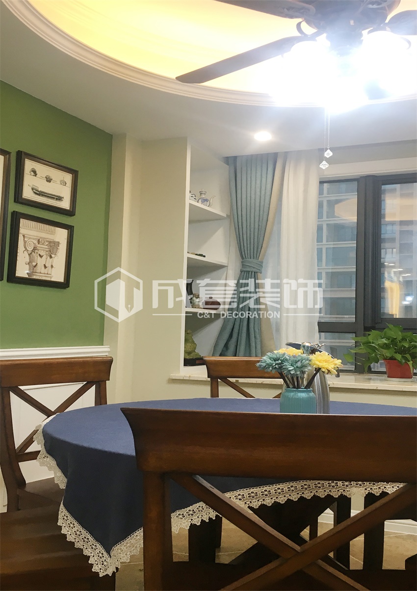 日光渐盛,一室温暖。客厅是承载一个家庭最多互动的场所,我们期望在这里能让来访的客人自在舒适,也希望家人能够享受在这里围坐闲话的过程。木质茶几,皮质沙发,敛去棱角,让紧绷的人也能在这里彻底的放松下来;雾霾蓝的窗帘带着令人沉浸的魅力。