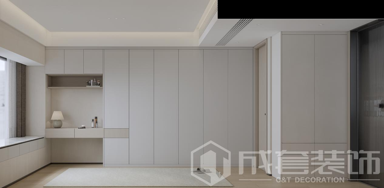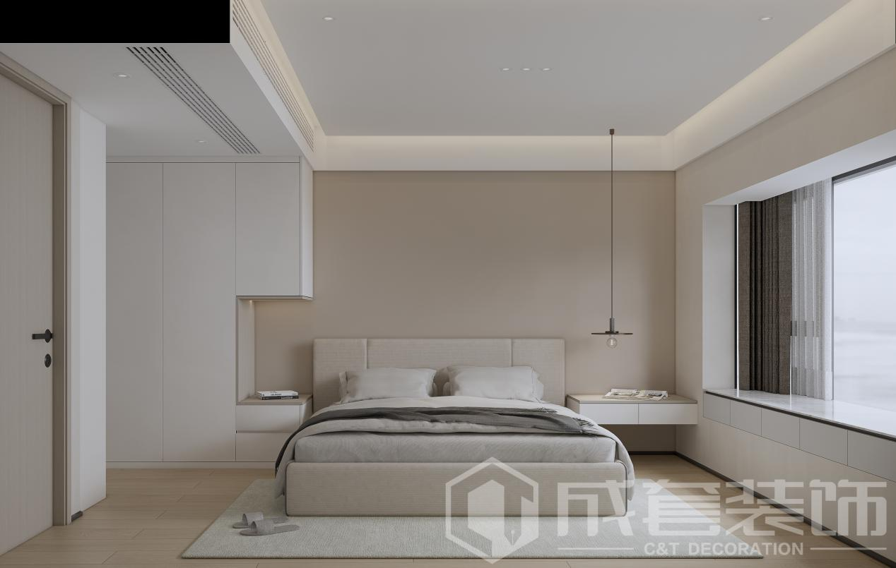 主卧房间没有选择复杂的墙板、硬包等材料,而是延用了客厅的艺术涂料,自然的肌理缓解了视觉上的疲劳感。