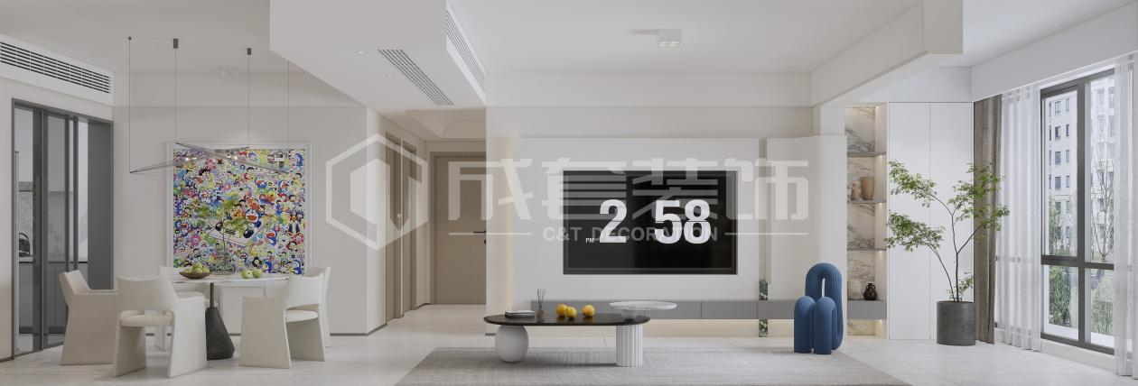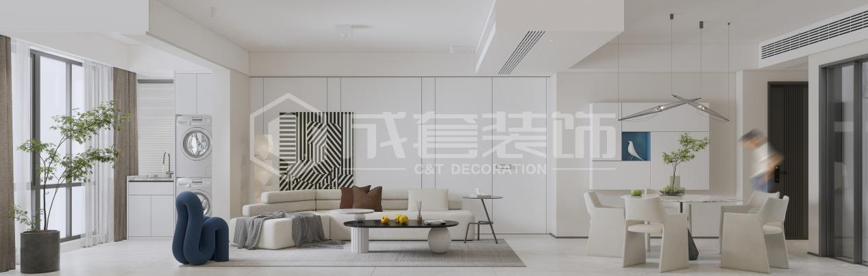 避免脏乱且保持各空间的相通,视野和沟通不受阻碍。圆形岩板餐桌,一家人用餐更温馨。