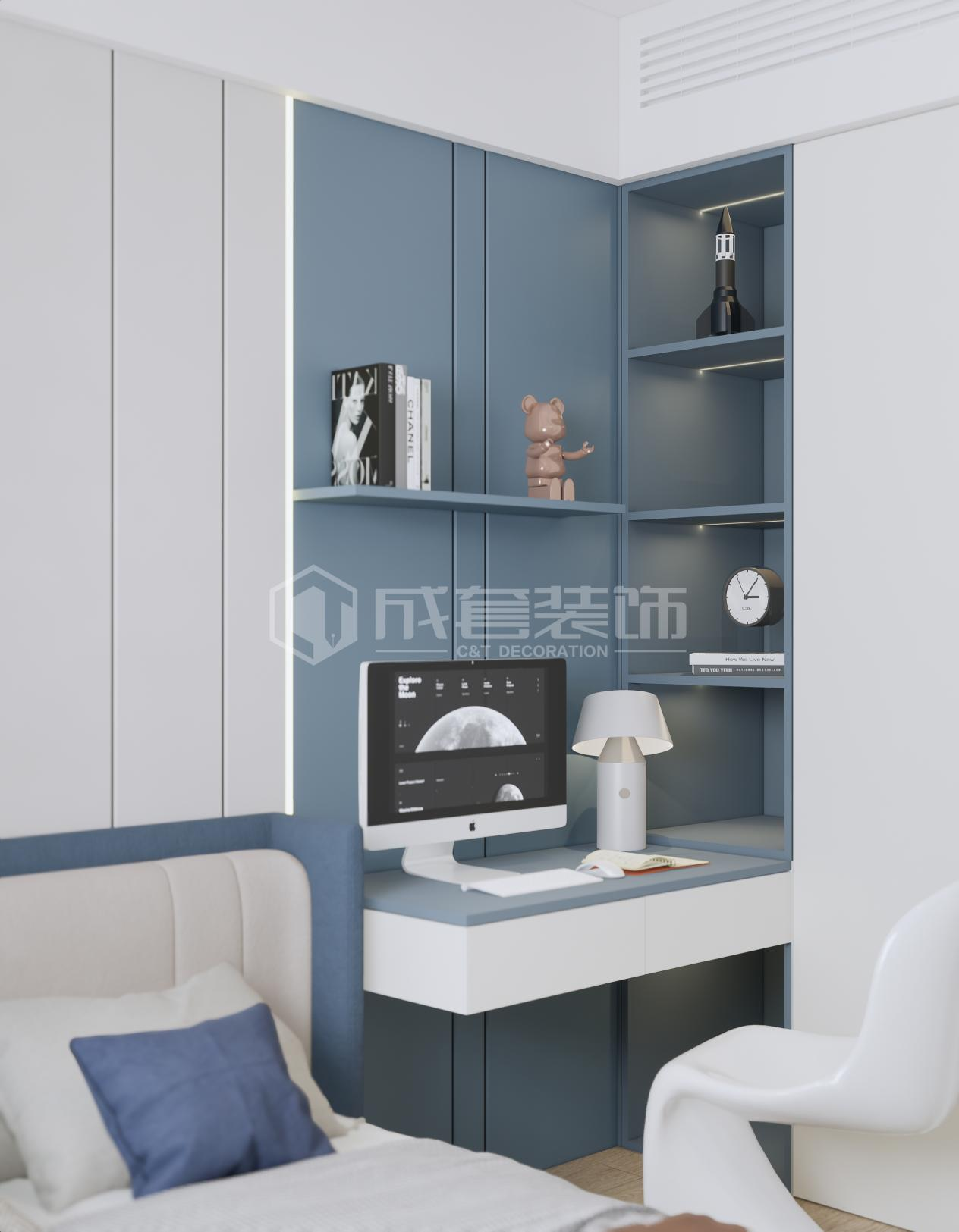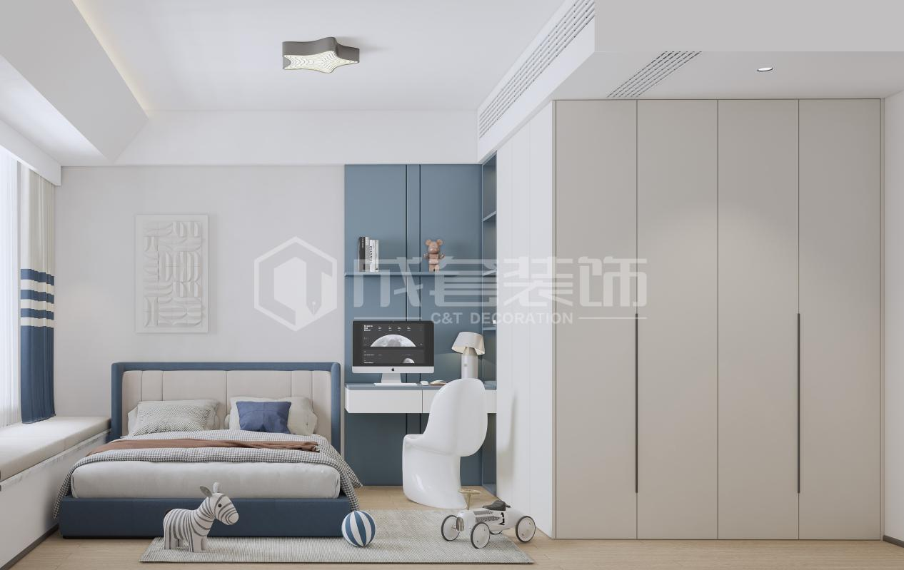 在现代风的基础上,儿童房点缀了沉静蓝,搭配童趣感的摆件玩偶,营造舒适空间。