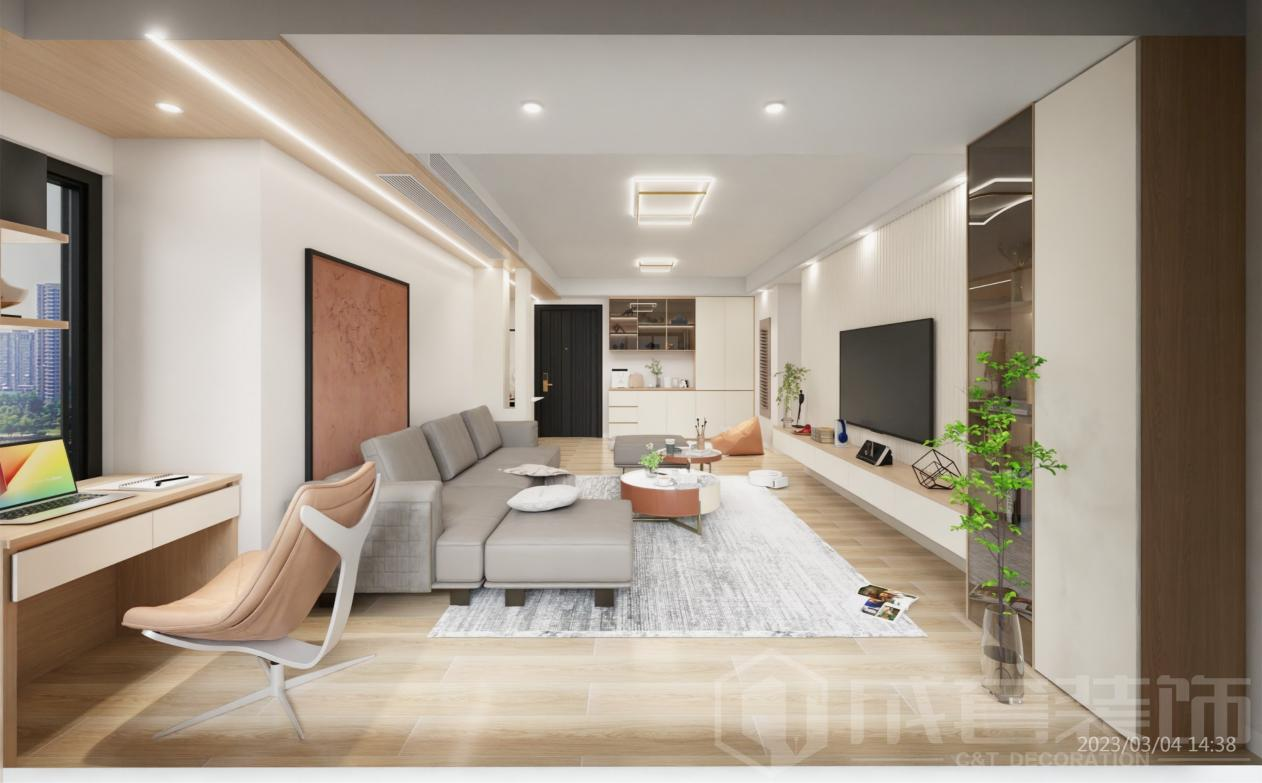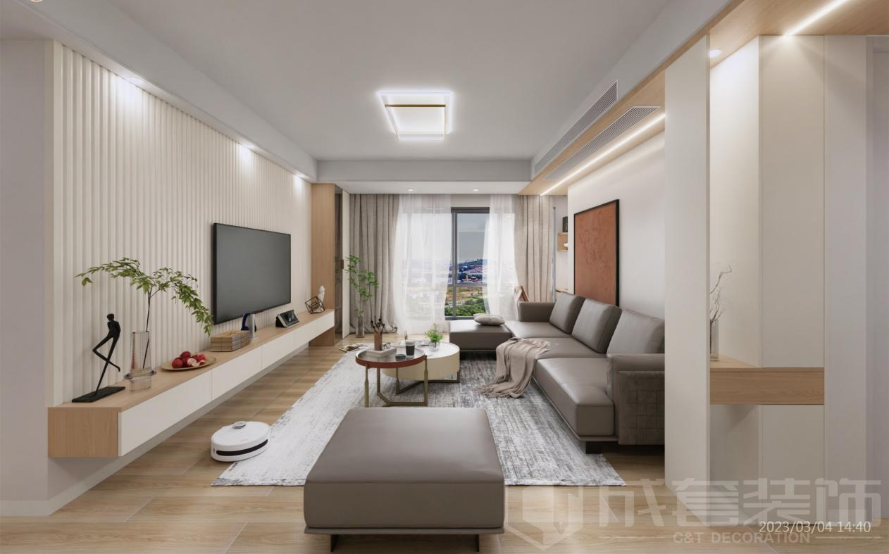 木地板和木饰面搭配白色背景,配上灰色系沙发,在颜色淡雅的空间里,