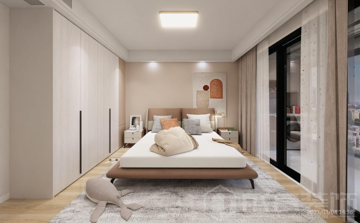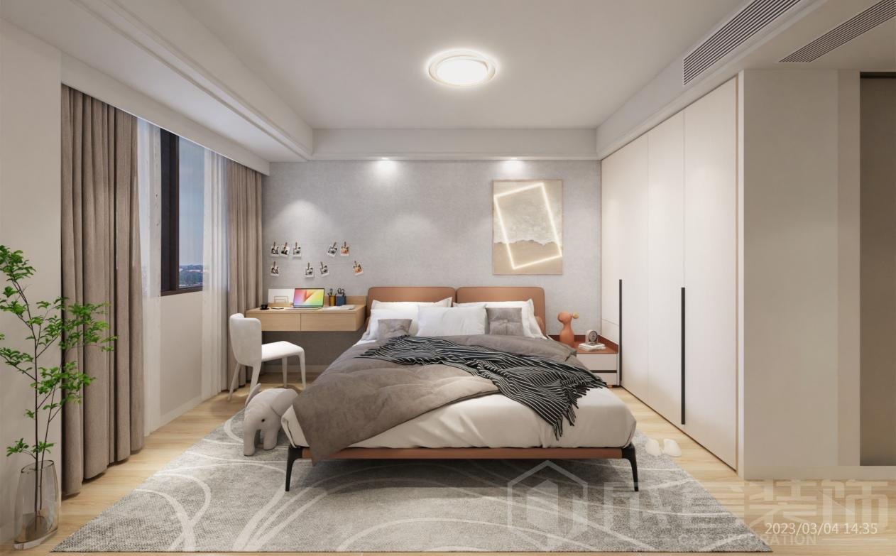 次卧延续了整洁简洁惬意的设计,超大通顶大衣柜更好的储物收纳。
