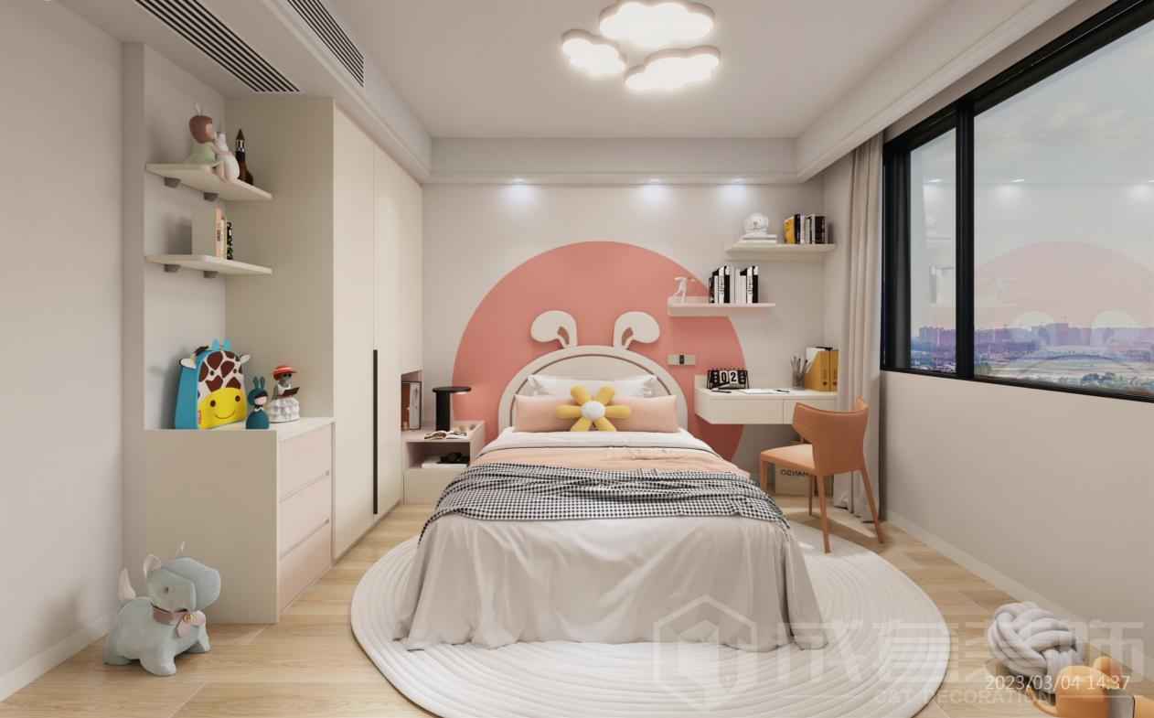 儿童房以小兔子造型的床为视觉中心,靠窗一侧设置了书桌,上方还打造了两层置物架,